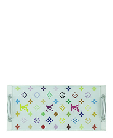 Get this LV tea tray for your home. No bordering makes it ideal to serve beverages and two sturdy handles on either side make for easy carrying and setting down.