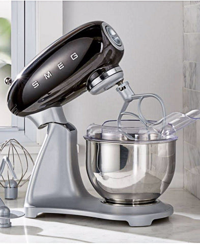 The Smeg Stand Mixer combines retro style and modern function. With 10 speeds and a 5-quart stainless steel mixing bowl, you can whip cream, mix cake batter, and knead bread dough. This mixer package includes a wire whisk, flat beater, dough hook, and pouring shield.